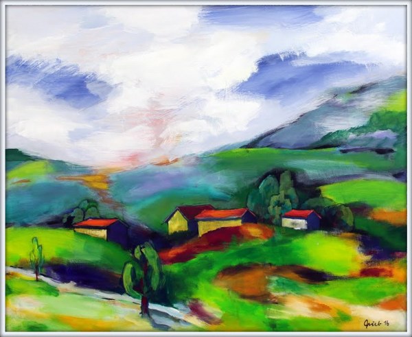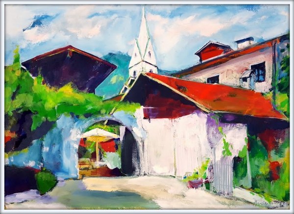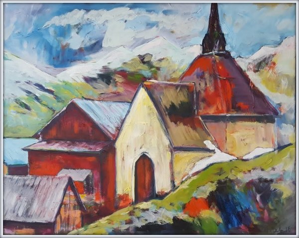 Bergdorf im Frühling, 100x80, Acryl/Leinen, #160703
