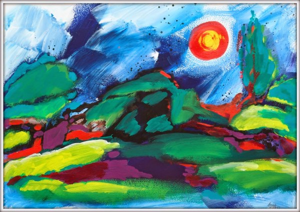 Landschaft mit roter Sonne, Acryl/Karton, 61x86, 1995, #950703